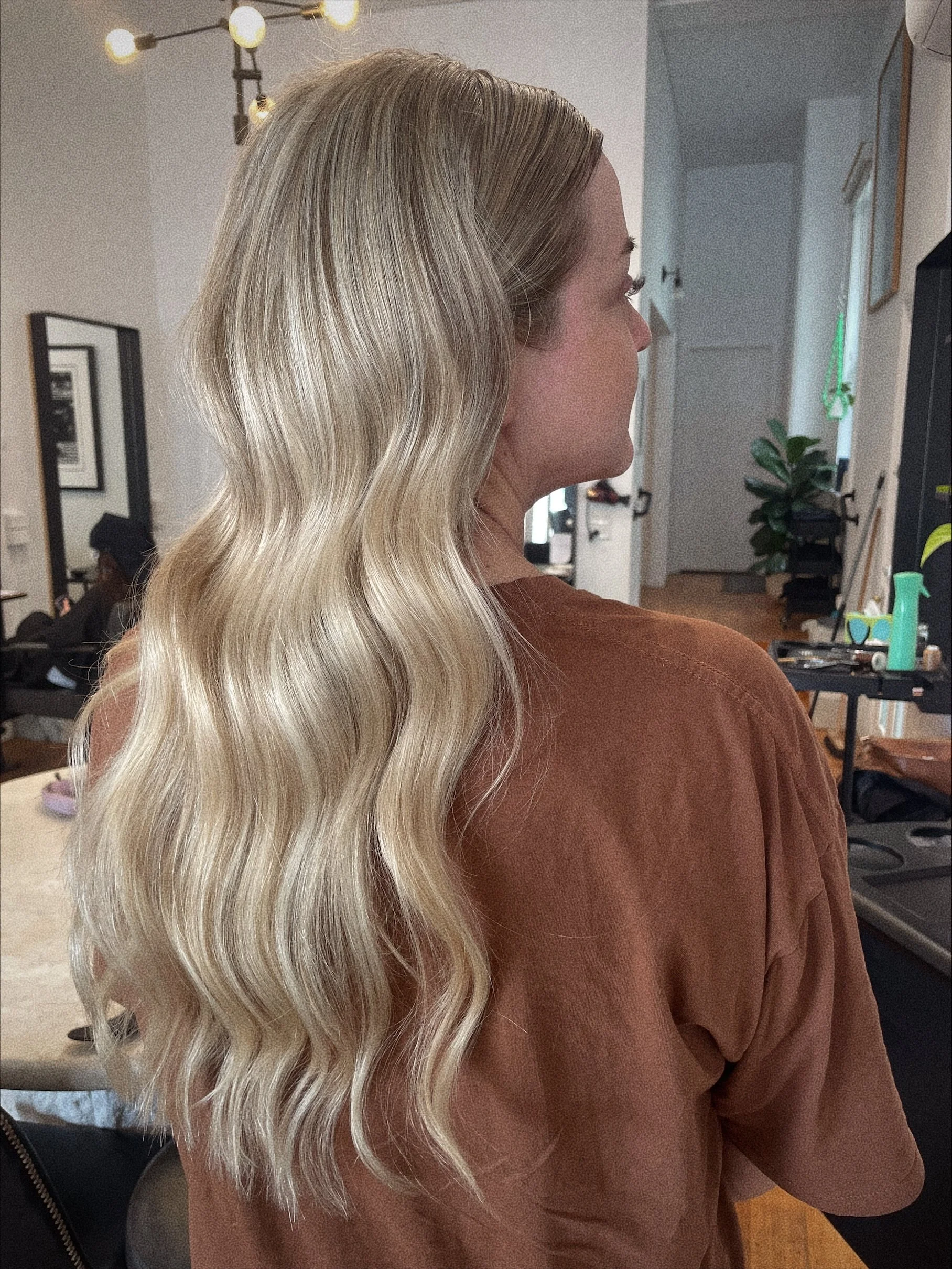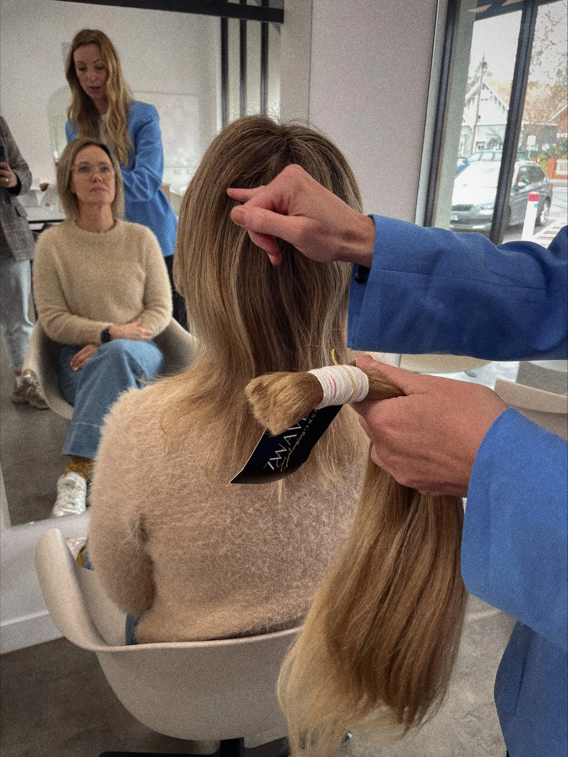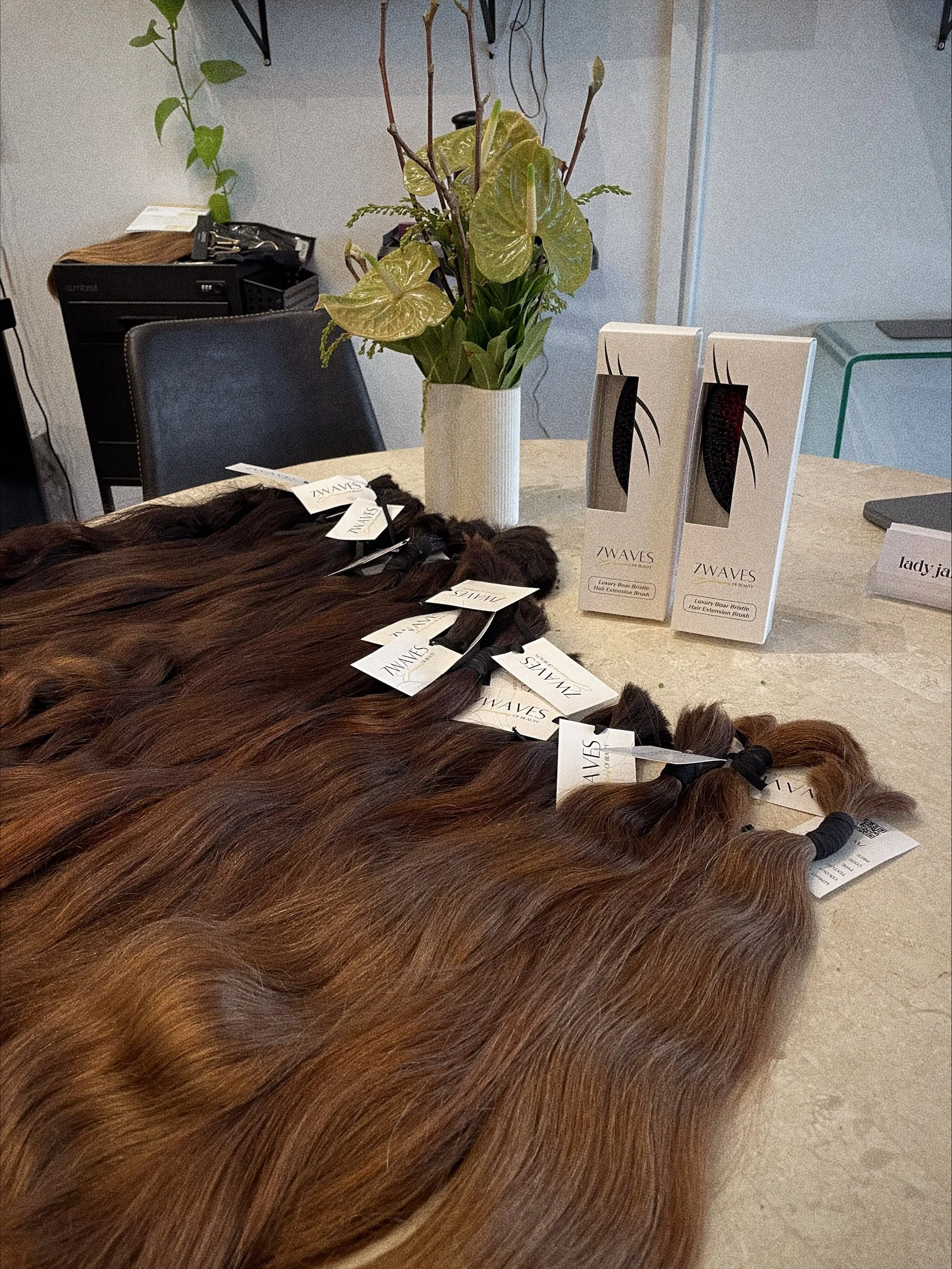 Here at Birdi, we offer premium virgin hair available exclusively in custom hand-tied wefts. Each piece is carefully crafted to suit the unique length and width needs of every client. Unlike machine-made options, our hand-tied wefts allow for precise control over the amount of hair used, making it easy to create your ideal volume while maintaining a seamless, natural finish.